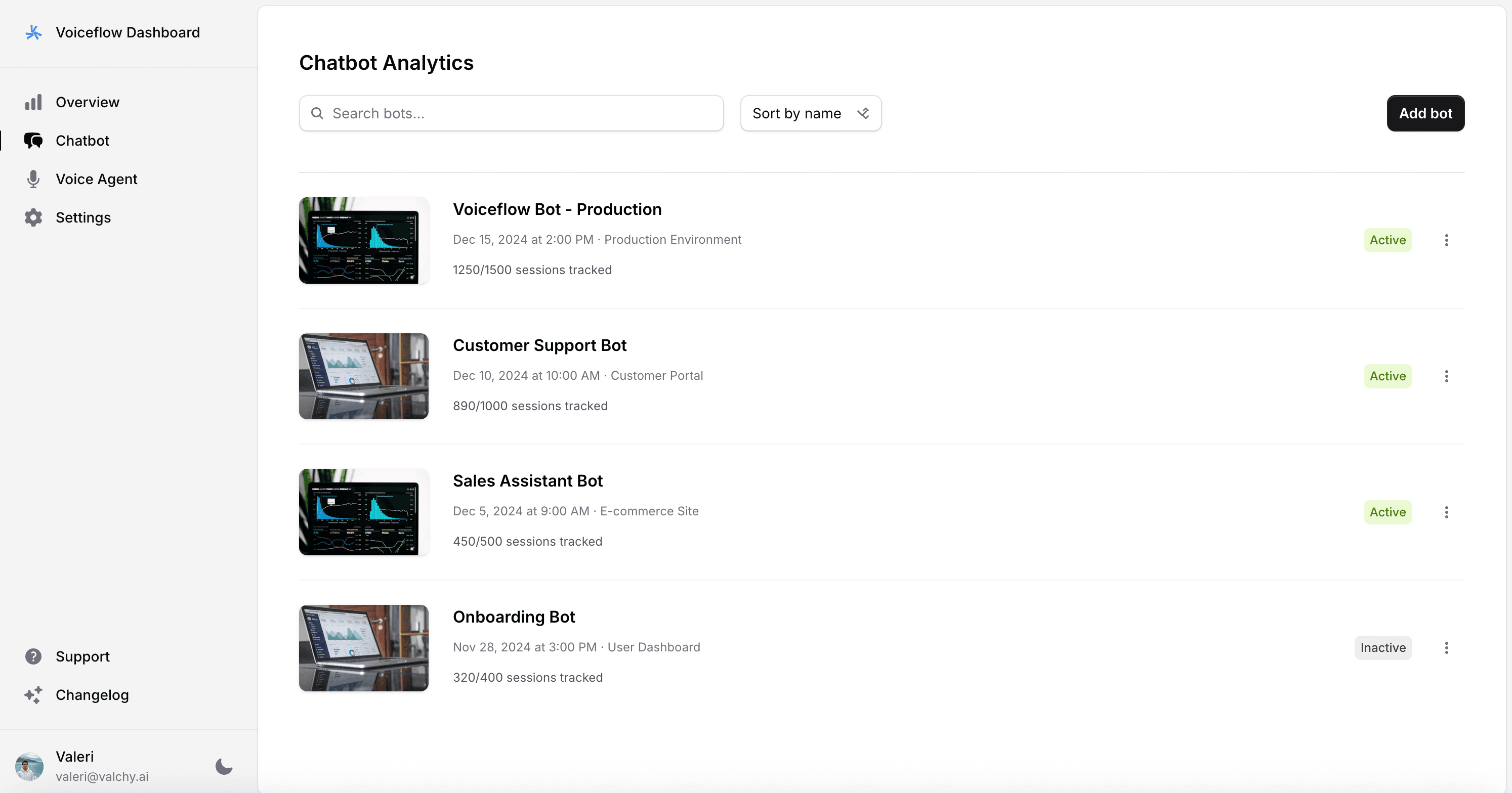 Voiceflow developers and agencies use this dashboard to prove ROI, deliver professional insights, and build stronger client relationships.