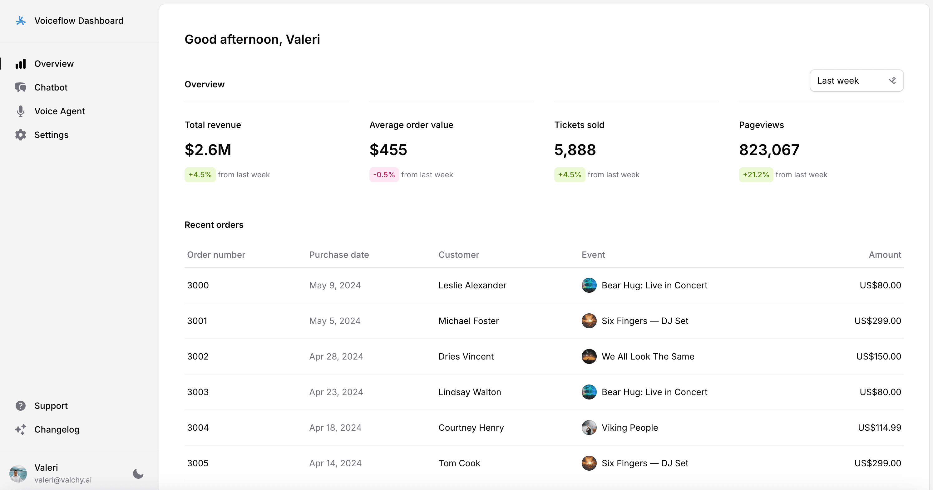 Voiceflow developers and agencies use this dashboard to prove ROI, deliver professional insights, and build stronger client relationships.
