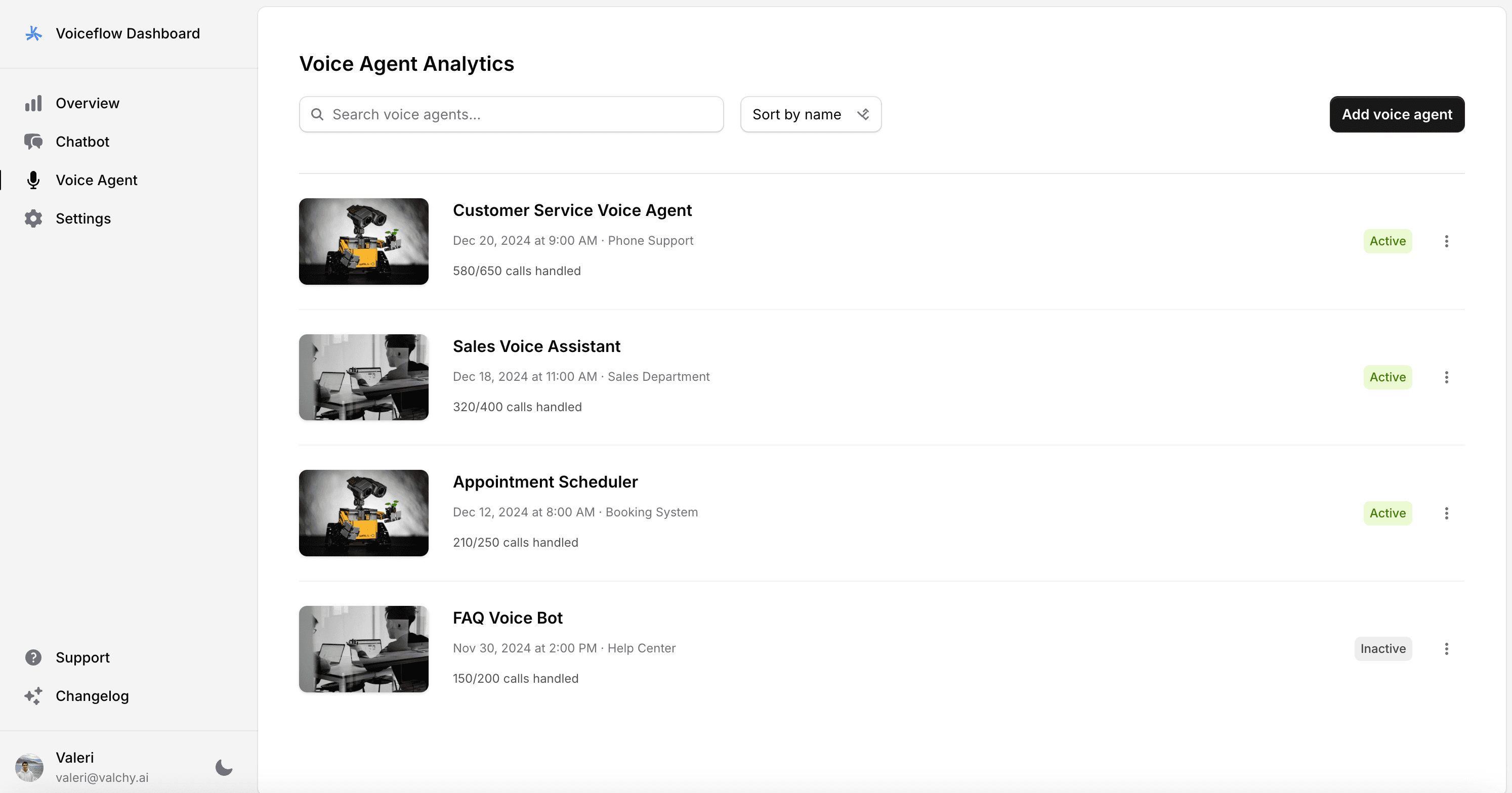 You can launch and manage outbound voice agent campaigns directly from the dashboard. This is unique to our platform—no other Voiceflow product offers this, giving you a competitive edge.